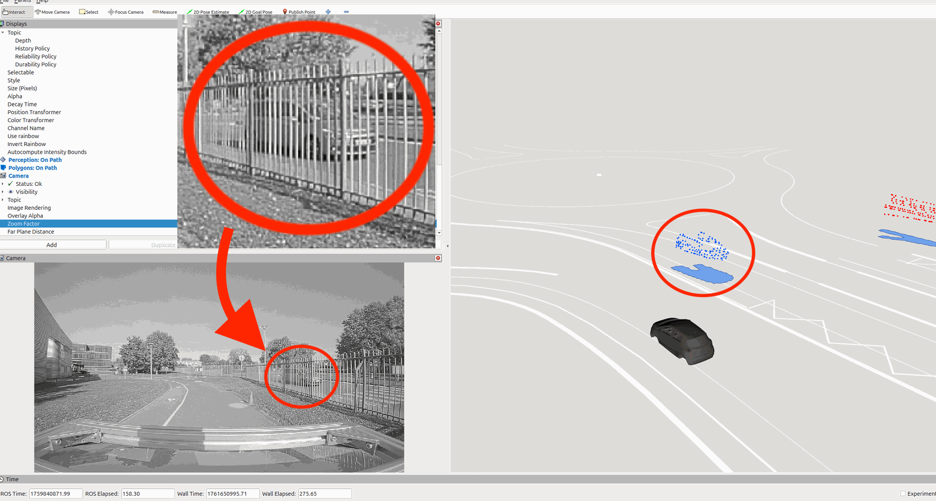 The Fig. 6 shows an example where the pipeline detection can detect a vehicle through the barrier between the ego vehicle and the vehicle detected. The red circle shows the vehicle in the image frame and RViZ display.
