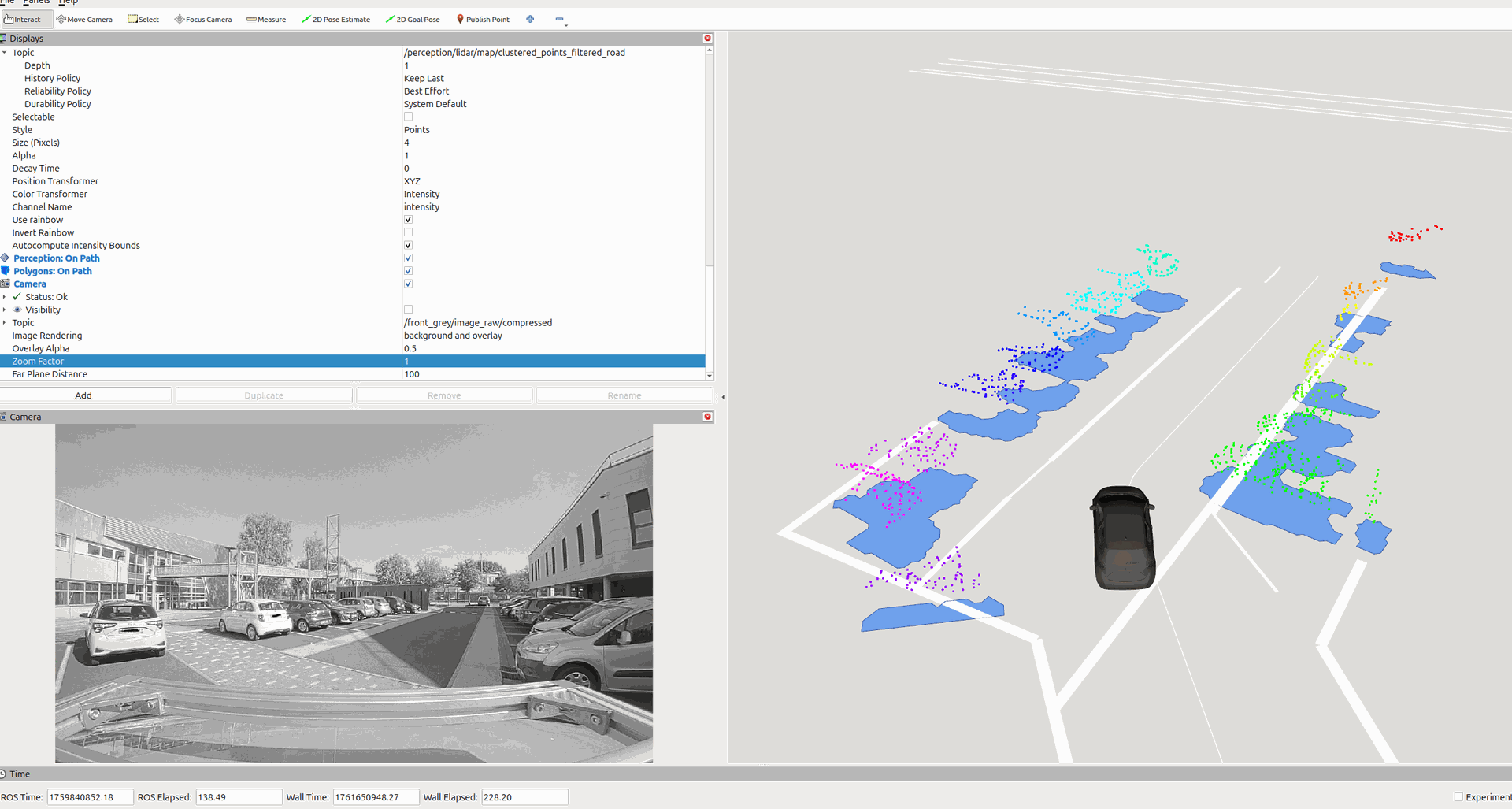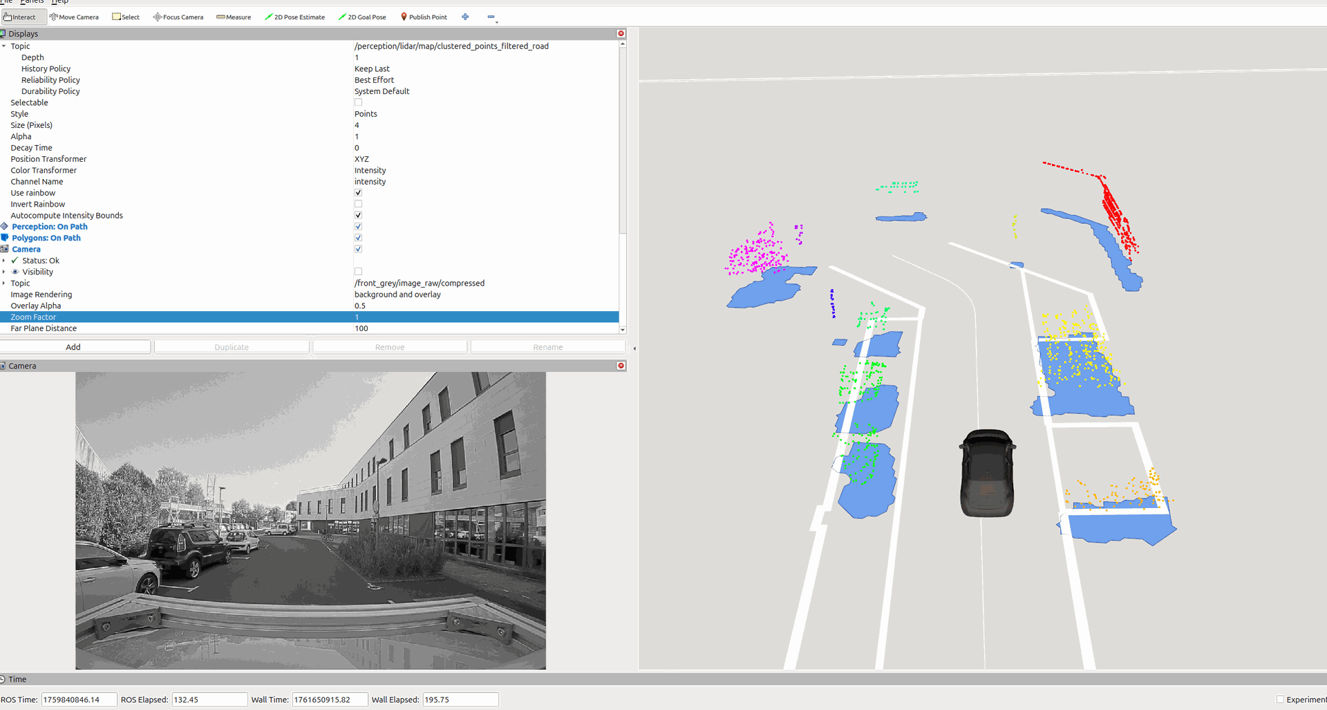 | 4. Cluster Filtering | PCL2 (lidar) → PCL2 (lidar) | Removes clusters below size or height thresholds to discard irrelevant objects. |
