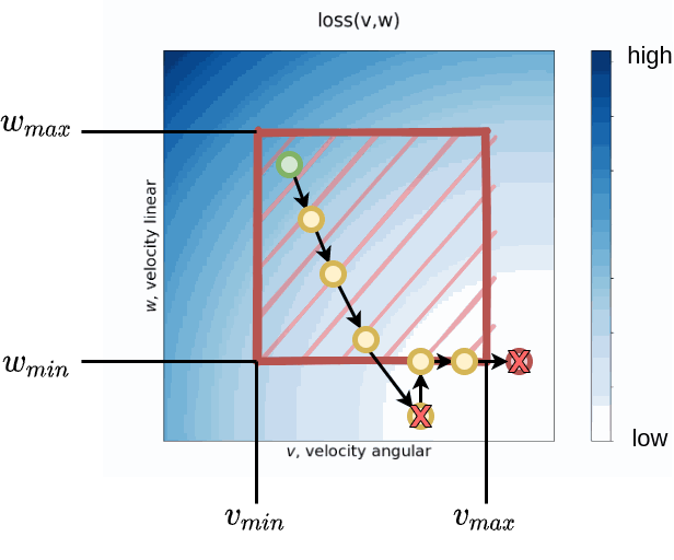 $$ \mathcal{L}(v, \omega) = \lambda_1 \cdot \mathcal{C}_{goal} + \lambda_2 \cdot \mathcal{C}_{distance} + \lambda_3 \cdot \mathcal{C}_{speed} \quad \text{Eq (1)} $$