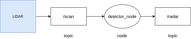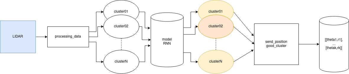 A ROS node, detector_node, subscribes to /scan. Incoming scans are clustered and converted into sequences, which are classified by the trained LSTM. Detected positions are published to /radar.