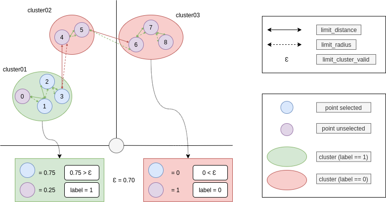 Two points are connected if both metrics are below thresholds limit_distance and limit_radius. Each connected component (cluster) is encoded as an angle-ordered sequence:
