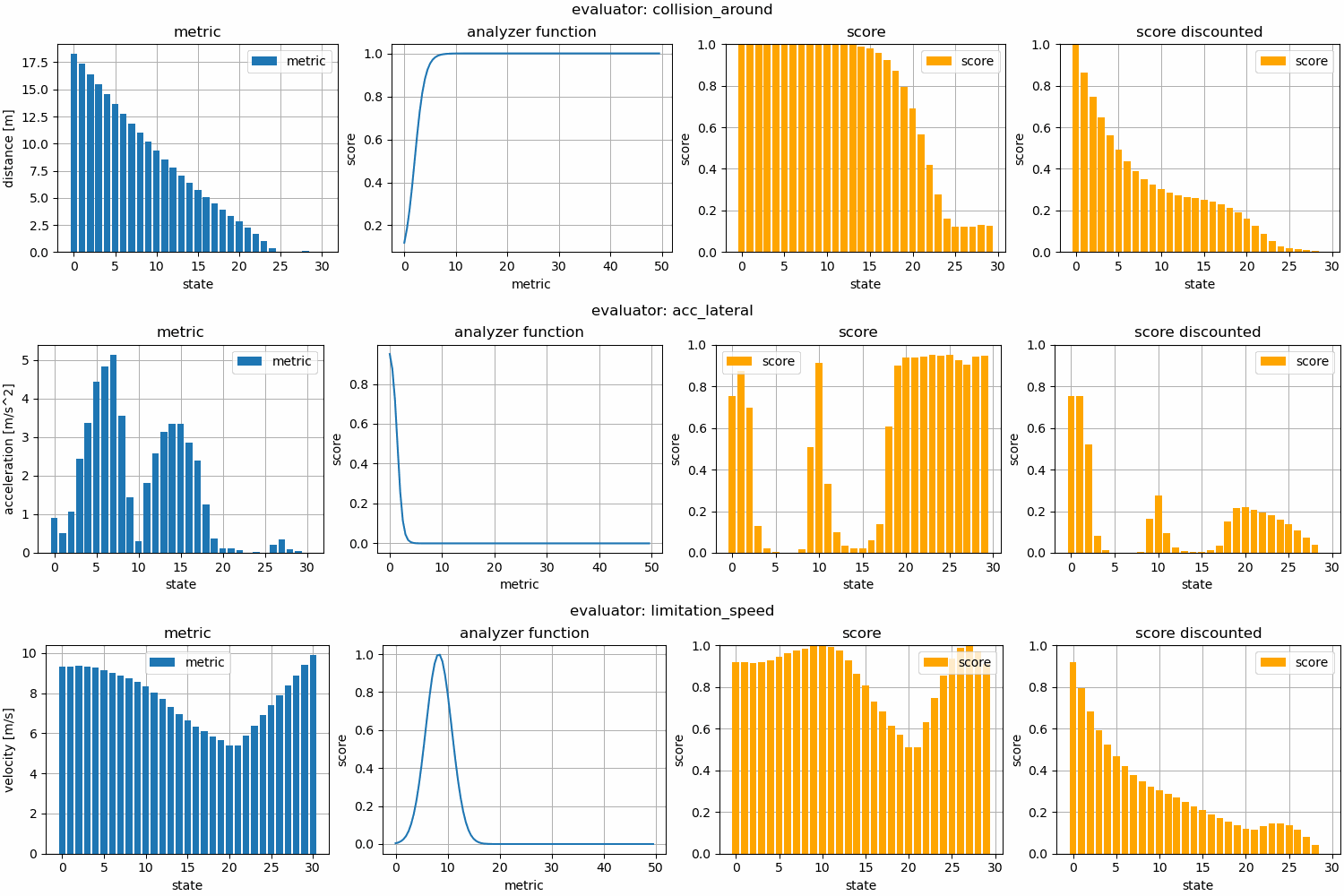 context: environment description (obstacles, road structure)- $f_k$: metric function for evaluator $k$ (e.g. lateral acceleration, speed violation)
