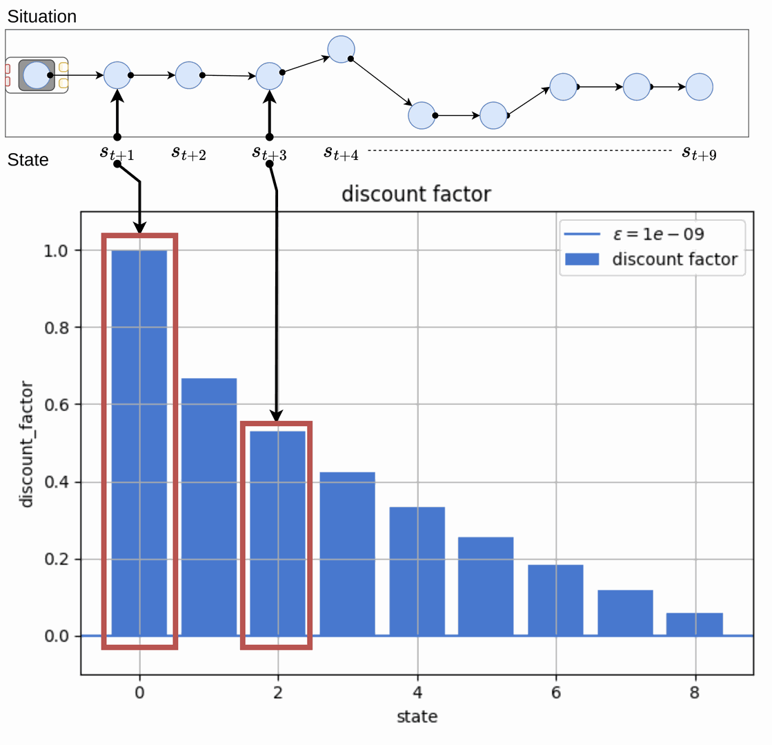 To give more weight to early decisions (e.g. avoid imminent risks), exponential discounting is applied: