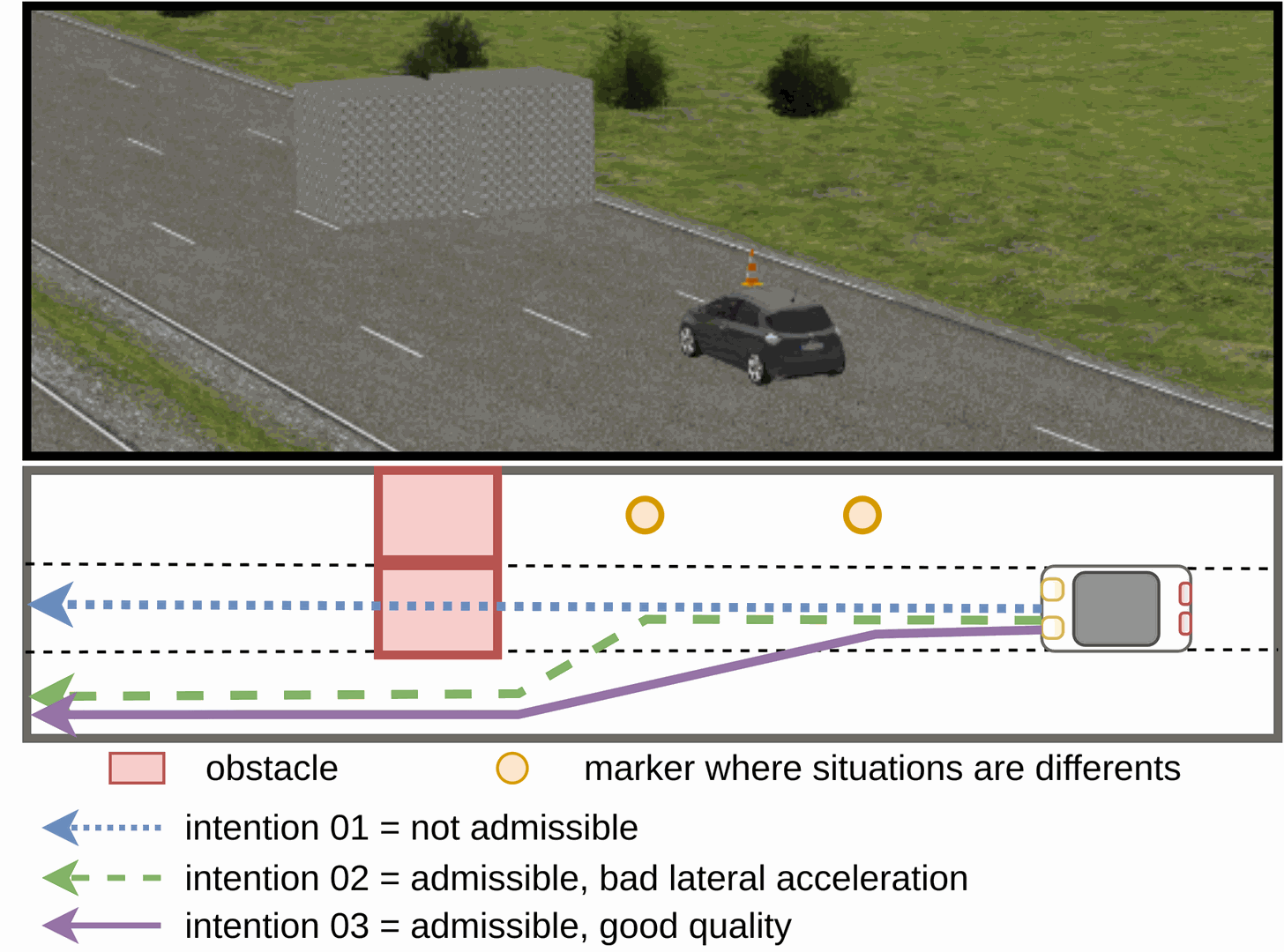 The quantification framework has been exploited to evaluate multiple driving intentions for the same scenario. The example below considers a situation where the vehicle must navigate around a static obstacle ahead.