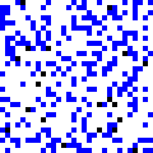 Robots (black) navigate to find resources (blue).