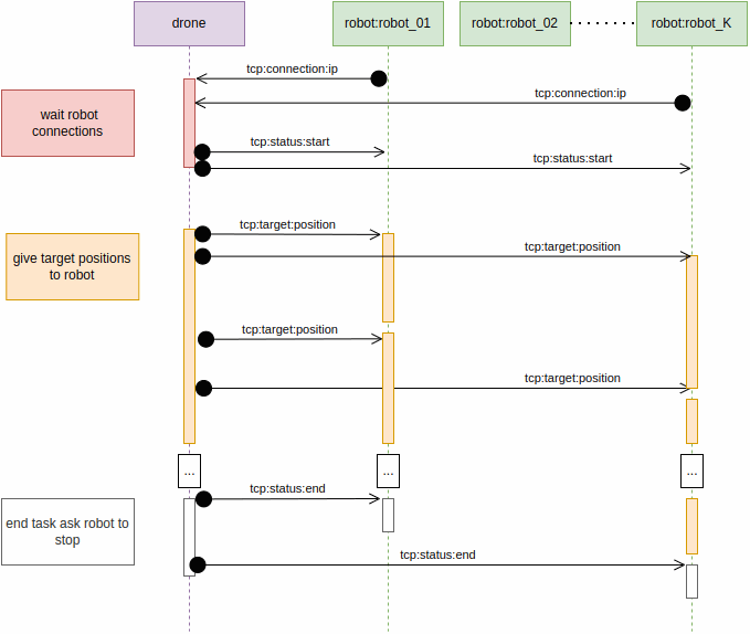 Lightweight platforms communicating with UGVs via TCP. Each drone exchanges structured task data and state updates with a specific ground robot.